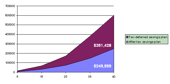 The power of tax-deferred savingsOver the long term, the difference between investing through a tax-deferred saving’s plan and investing with after-tax dollars is significant. The chart below assumes monthly investments of $100 and an annual return of 8% compounded monthly. The money you invest in a 401k plan goes to work right away, generating earnings that compound tax deferred. Why Invest in Mutual Funds?A mutual fund pools the money of its shareholders and invests in many stocks, bonds and other securities. Each fund has an investment objective shared by its investors---to provide current income, for example, or long-term growth. Each mutual fund holds many securities and is thus diversified and less likely to respond to the fluctuations of the market as a single stock or bond would. Four investment strategies:Growth Designed to maximize the value of your investment over time, growth funds invest in stocks that have a strong potential for providing above-average growth. Growth and Income Designed to provide both regular income and long-term growth in the value of your investments, growth and income funds invest in stocks, bonds or a combination of both. Income Designed to provide a regular stream of income, income funds invest in interest-paying bonds, stocks that pay regular dividends, or a combination of both. Capital Preservation Designed to maintain a stable price share while providing current income, capital preservation funds include money and market funds. Life-Stage Financial PlanningThe charts below illustrate how investment objectives at four different stages of life might be met using mutual funds.